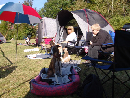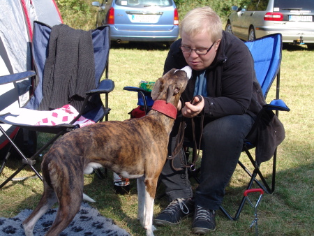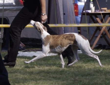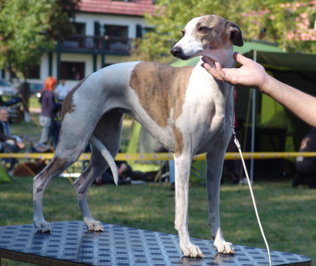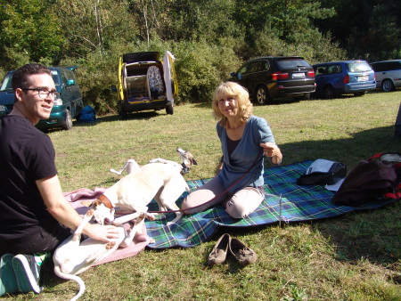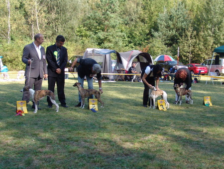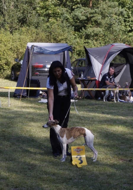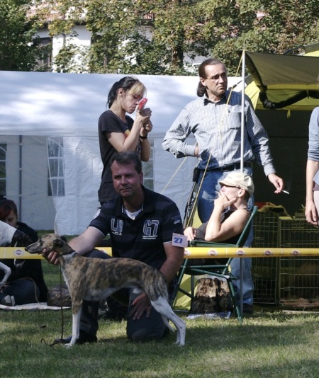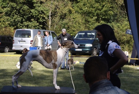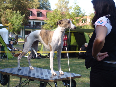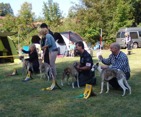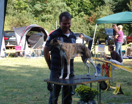 Wir fuhren gemeinsam mit Uli und Tanja zum Waldhotel Wandlitz, welches einen angrenzenden Platz als Ausstellungsgelände zur Verfügung stellte. Vor Ort trafen wir uns mit Tanja und Floppy. Es war eine kleine, gemütliche Ausstellung, bei der ca. 20 Whippets unter dem Richter Darko Petreski/Kroatien gerichtet wurden, unter ihnen Kopete und – nach längerer Ausstellungspause – Ulrikes Machu. Beide Hunde, die sich bestens in der offenen Klasse präsentierten, erhielten ein platziertes „sg3“?!