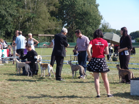 Robin, Sony und Turini verhielten sich vorbildlich und geduldig an ihrem Plätzchen, bis schließlich das Richten der Whippethündinnen (offene Klasse) gegen ca. 15:30 Uhr zu Ende war.