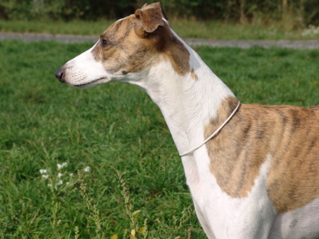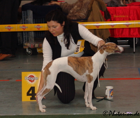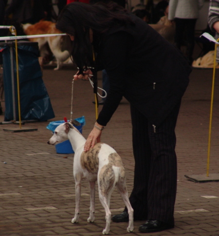 Die Whippets wurden von Herrn Baumann gerichtet. Als Erster durfte Tanjas Floppy (Photarion´s Azurit) in den Ring. Er wurde in der Jugendklasse der Rüden mit einem „SG 2“ bedacht mit einem sehr schönen Richterbericht, den wir hier gerne veröffentlichen wollen: