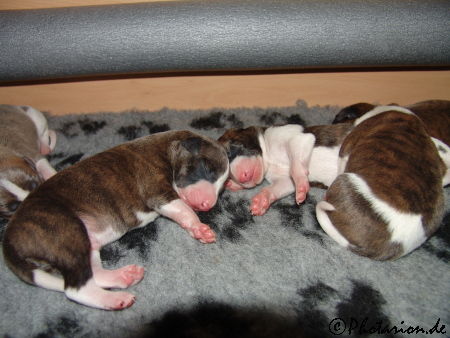 wurden die kleinen Edelsteine am Samstag und ihre Entwicklung ist prächtig. So schnell wie sie den Mutterleib verlassen haben, nämlich am 59. Trächtigkeitstag, so forsch bewegen sie sich auch in der Wurfkiste. Sie robben sich von links nach rechts um sich ein gemütliches Plätzchen zu suchen, oder um an Mamas Milchleiste zu gelangen. Durch kräftiges Quietschen zeigen sie an, wenn ihnen irgend etwas nicht behagt. Das Mädchen Aventurin (Turini) zeigte schon Reflexe als ich sie am Köpfchen steichelte, sie hob das Füßchen um sich selbst zu kraulen und die kleine Amazonit (Sony) versuchte ihrer Mama zaghaft das Gesicht zu lecken. Sie sind einfach goldig die Puppies. ;-)