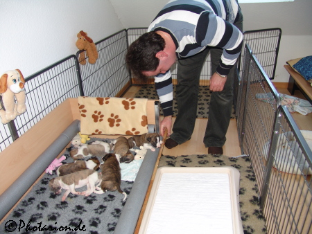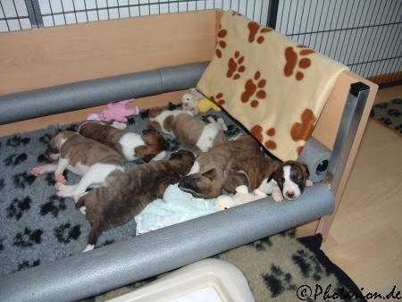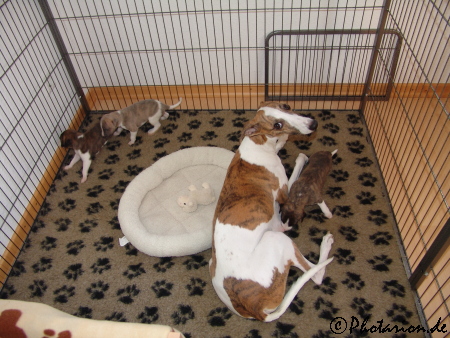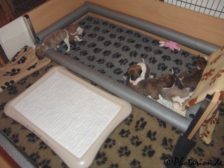 Da die Puppies nun immer lebhafter werden haben wir die Wurfkiste verändert. Eigentlich sollte ja der große Lederkorb in den Zwinger gestellt werden, aber die Süßen lieben ihre Kiste mit den Schaumstoffpuffern zu sehr. Wir haben alle Einstiegbretter herausgenommen und eine „Rampe“ aus kissen gebaut, dass sie nicht rauspurzeln können und somit haben sie doppelt so viel Platz.