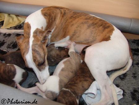 Was auch sehr erfreulich ist, Robin darf nun ins Welpenzimmer und kann sich aufs Bett legen und Kopete leckt ihr dabei die Ohren, „Traute Zweisamkeit mit Sechslingen“. ;-)