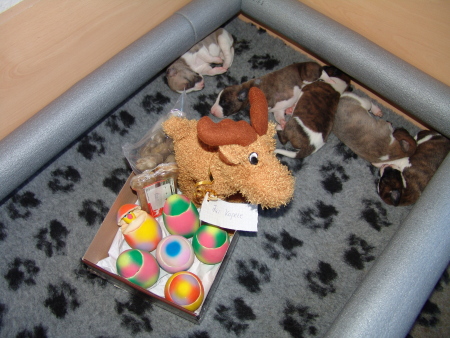 6 bunte Quietscheeier für die Puppies, wenn man darauf drückt kommt ein kleines Küken oben raus, einen Wuffi für Kopete und ganz viele Kauknochen für Robin.