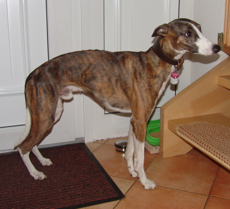 Floppy, ist ein hochtypischer Vertreter der Rasse Whippet. Seine Fellfärbung finde ich mega schön, er ist ein absolut toller Whippet. Jawohl.