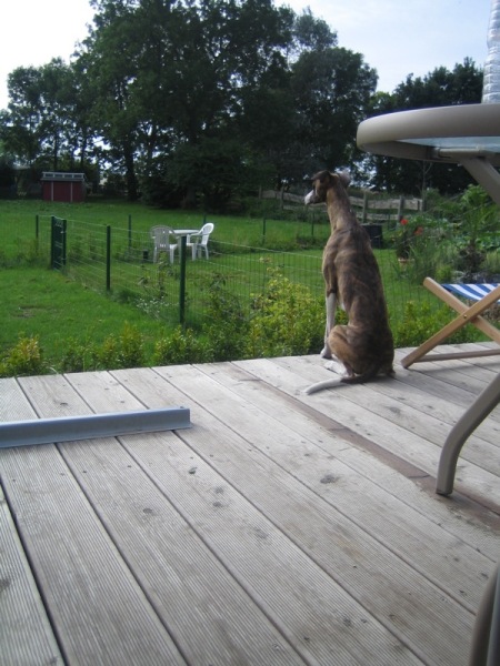 Gestern unternahmen Tanja und ich einen gemeinsamen Spaziergang mit unseren Whippis. Die Geschwister, sowie die Mama und die „Tante“ hatten ihren Spaß miteinander. Anschließend nutzten wir noch die Sonne aus, um auf unserer Terrasse einen „Kaffeeklatsch“ zu halten. Floppy freut sich immer, wenn er zu uns kommt. Er erkundet jedesmal seine Geburtsstätte. Zuerst flitzt er durch den Garten und dann durchs Haus.