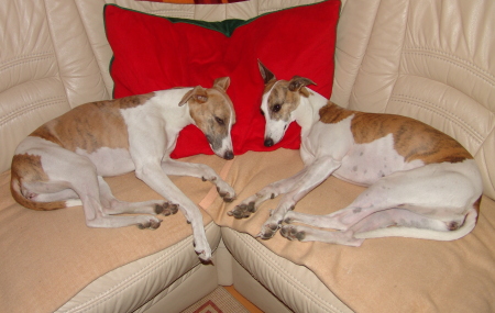 So liegen die Damen aber nur wenn Herrchen und Frauchen da sind und wenn ich aufpasse leigen die Damen oben im Bett auser Robin aber sehr süßes Bild.