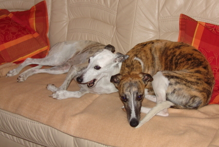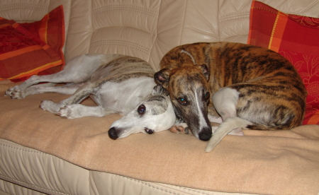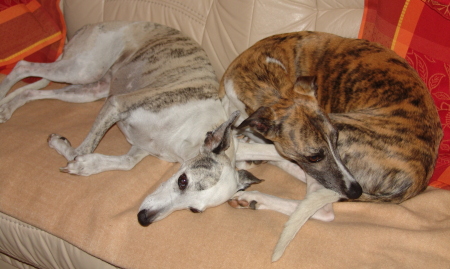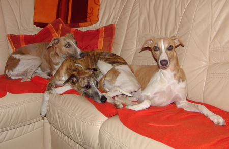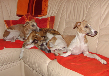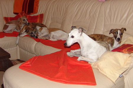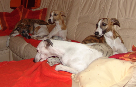 Auch Uli ist ja öfter mit ihren Jungs bei uns. Da gibt es nichts Schöneres für die Whippchen, als miteinander auf der Couch zu Lümmeln und zu Kuscheln.
