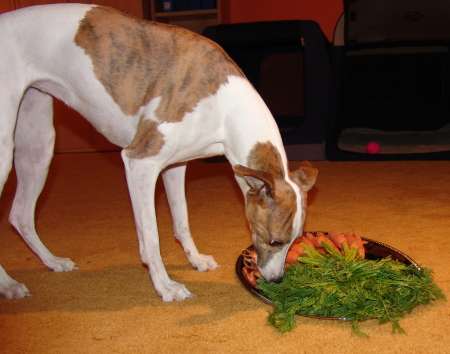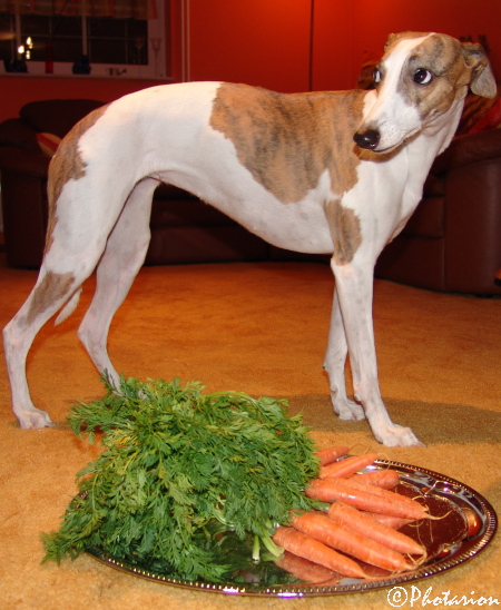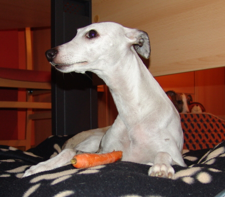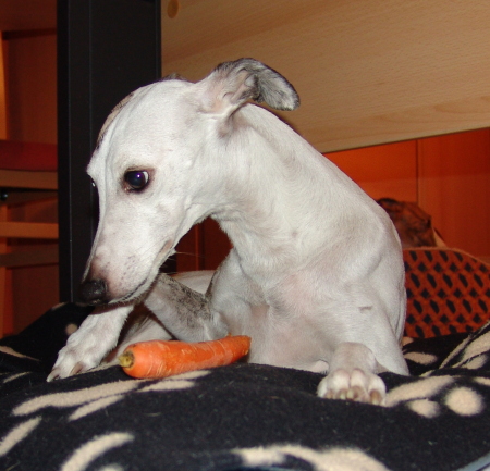 Ich biete ihr das Fressen in mehreren kleinen Portionen am Tag an, mit Vorliebe nimmt sie zur Zeit frische Möhren zu sich. Also man sieht, auch schwangere Hündinnen haben so ihre Freßgelüste.