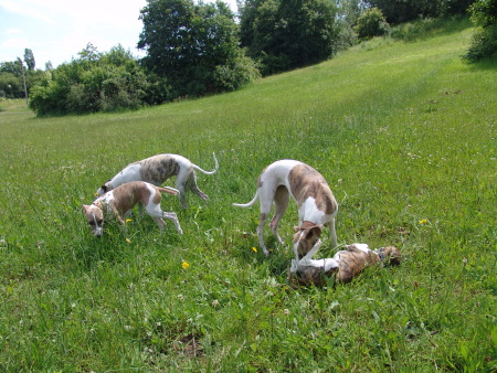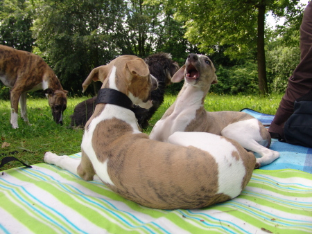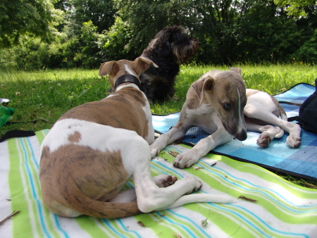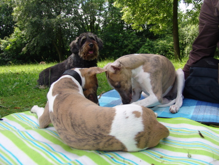 Ulrike und ich treffen uns öfter mit unseren Hunden im Park. Dort können sie flitzen und miteinander spielen. Machu ist mehr an Robin und Kopete interessiert, mit ihnen kann er so richtig durchstarten. Marley, Sony und Turini versuchen es dann den Großen nachzumachen oder sie spielen zu dritt verrückt. Moritz, der dicke 10 jährige Rauhaardackel von Ulrikes Eltern, ist auch manchmal dabei und hat ebenso seine Freude.