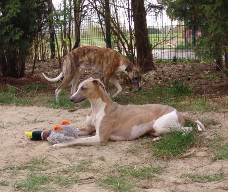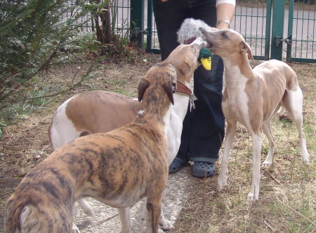 Die Ente war gestern auch wieder „dran“ und durfte buchstäblich durch den Garten fliegen, weil die Whippen sie sich im Affenzahn gegenseitig abgejagt haben. Wie beim Staffellauf. Quak-quak. Bestimmt würden sie die Mädels gern einladen, an diesem schönen Spiel teilzuhaben.