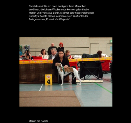 Anläßlich der Ausstellung in Annbaberg-Buchholz haben wir die nette Eva mit ihrem süßen „Maxwell“ Whipcat X-tra special kennengelernt. Eva lebt aktiv mit ihren 3 Whippets und berichtet darüber auf ihrer Homepage.