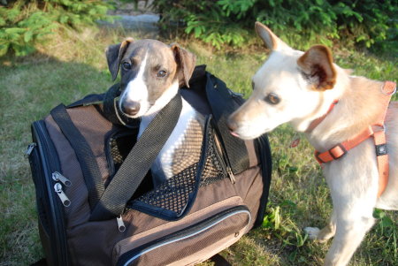 Amy hat einen schicken Welpenrucksack, da kann sie sich während der längeren Spaziergänge und Fahrradfahrten reinsetzen und ausruhen. Eine tolle Idee, finde ich.