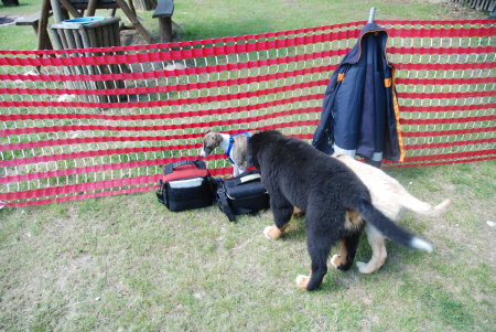 In der Welpenspielstunde machte sie Bekanntschaft mit zwei großen Welpen, die ihr ein wenig Angst machten und sie so bei ihrem Frauchen Schutz suchte. Leider sind es nur diese Drei in der Runde. Conny schaut mal, wie es beim nächsten Mal wird.