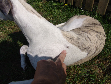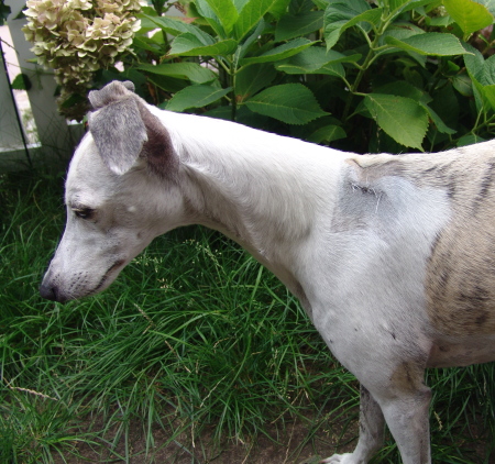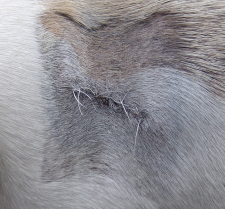 Die knapp 4 cm lange Narbe sieht sehr gut aus und das abrasierte Haar wächst schon wieder nach. Nach 10 Tagen werden die Fäden gezogen und dann erhalten wir auch den Befund der Gewebeuntersuchung. Unserer TÄ sind wir sehr dankbar für die kompetente und liebevolle Versorgung unserer Robin. Wir sind sehr stolz auf unser tapferes Whippetmädchen.