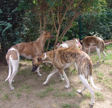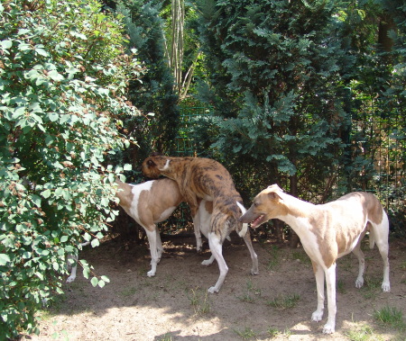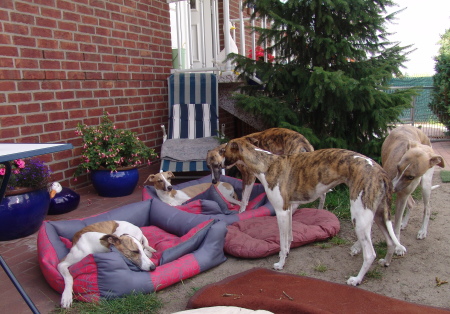 Unsere sechs Whippis verstehen sich blendend und sie freuen sich über jedes Zusammensein. Sonys beginnende zweite Läufigkeit weckt bei Onkel Machu großes Interesse, wobei Marley noch eher etwas verschämt ist.