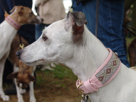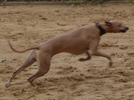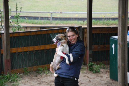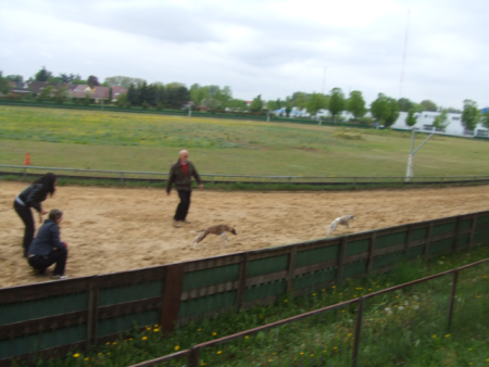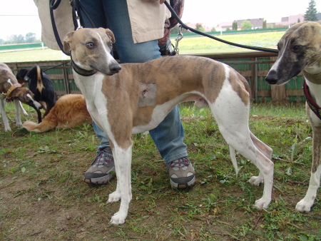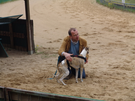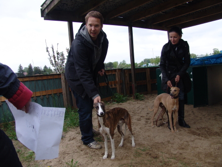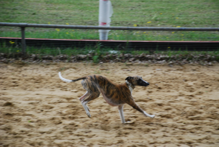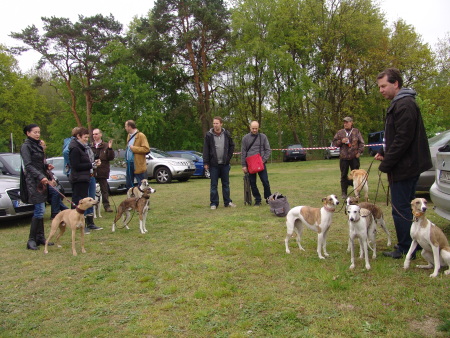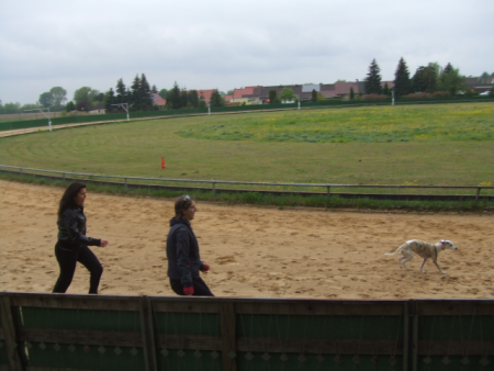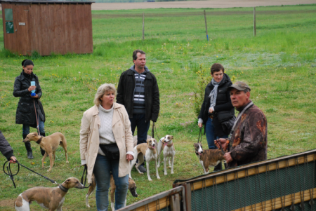 Auch für unsere Mädels war es, bis auf Robin, eine Premiere. Der Einzelstart musste auch für sie erstmal verständlich werden. Erst als Frauchen ein paar Meter mitrannte und Herrchen am anderen Ende der 100 Meter Sandbahn mit Rufen lockte, wetzten sie über die Bahn. Beim nächsten Durchlauf rannten sie jeweils zu zweit. Robin mit Turini, wobei Robin mit ihren fast 9,5 Jahren unserer 14 Monate alten Turini in Nichts nachstand. Kopete lief mit Tochter Sony und Beide gaben ebenfalls vollen Speed. Leider durfte unser tapferer Marley mit seiner Bisswunde nicht starten. Er beobachtete dafür am Rande der Bahn sehr aufmerksam das Geschehen. Diese Aufmerksamkeit und Aufgeregtheit war auch bei jedem unserer zuschauenden Whippets zu beobachten. Robins zusätzliche schrille Lustschreie waren nicht zu überhören.