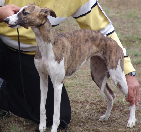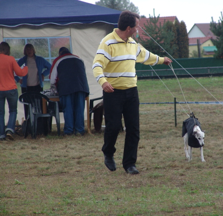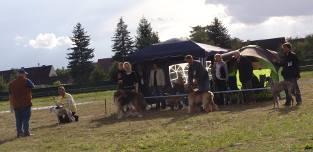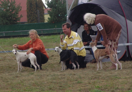 Wie bereits im Mai d.J. wurde die Ausstellung in Zehlendorf von Tim und Sandra Rürup geleitet und bestens organisiert. Es gab wieder repräsentative Ausstellungskataloge, dazu eine Piccolo und für die Vierbeiner Futterproben. Auch dieses Mal fehlte der vielgelobte Übungsring nicht. Es wurden Pokale verteilt und Präsente übergeben. Auch an die Herren Richter wurde hierbei gedacht. Die insgesamt 39 Whippets wurden von Herrn Ringer aus Österreich gerichtet. Mit Freundlichkeit und Witz stand er den Ausstellern gegenüber. Das Wetter zeigte sich von allen Seiten. Die Sonne kämpfte sich ab und an wärmend durch die Wolken, ansonsten war es bedeckt, verhältnismäßig frisch und teils stürmisch. Zwischendurch prasselte auch ein kräftiger Regenguss auf uns nieder.