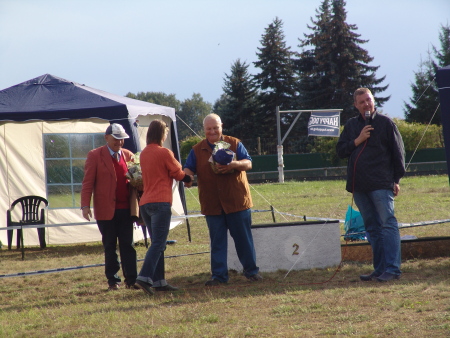 Dann folgte Frank mit Robin in der Veteranenklasse. Zu unserer großen Freude erhielt sie von Herrn Ringer das „V1“ mit dem „Veteranen CAC“ und das „Veteranen BOB“. Zum Abschluss präsentierte sich Robin mit den besten Veteranen aller Rassen (Vet.BIS). Hier überließ sie einem anderen Veteranen den Preis. Bevor Robin die „BOB-Runde“ machte, wurde der Himmel schwarz und es fing kräftig an zu regnen. Da die Süße am Vorabend die Fäden ihrer OP-Naht gezogen bekam und die Narbe noch vor Schmutz und Nässe geschützt werden sollte, bat ich Herrn Ringer um Erlaubnis, Robin einen Regenschutz beim Ausstellen umlegen zu dürfen. Er war sofort einverstanden und begründete es gegenüber den anderen Ausstellern. Über so viel Verständnis waren wir sehr erfreut.