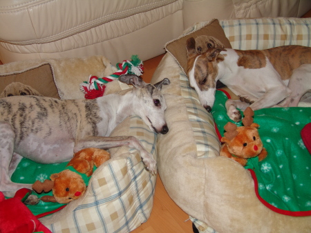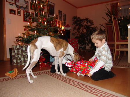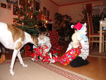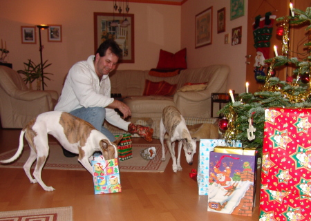 Heilig Abend am frühen Nachmittag konnten es Herrchen und die Hunde nicht mehr länger aushalten und fingen schon mal an mit der Bescherung.
