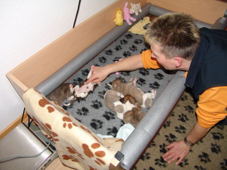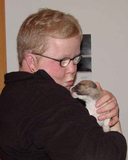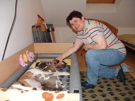 Auch Tanja kam zu Besuch und konnte nun endlich mal wieder in „Welpen baden“, wie sie es immer so schön ausdrückt, sie herzte ordentlich mit den Kleinen rum.