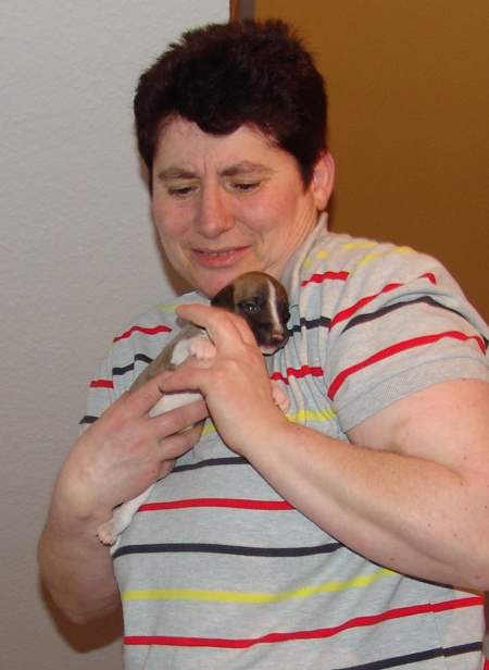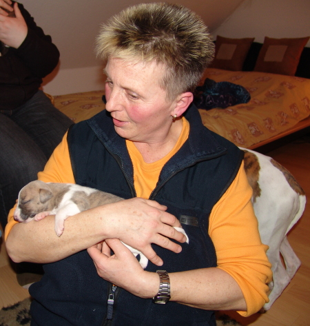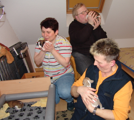 Sie waren so begeistert von den Puppies und wussten nicht wen sie zuerst knuddeln sollten. Claudia war besonders von der hübschen Achat angetan und Ilona schwebte auf „Welpenwolken“. ![]()