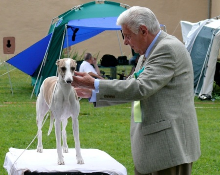 So zeige ich noch ein anmutiges Foto von Kopete, wie sie von Herrn Richter Max Magder (CAN) auf dem Richtertisch begutachtet wurde. Er war von ihrer Ruhe und ihrer Disziplin beeindruckt und schrieb u.a. in dem sehr schönen Richterbericht: she made a beautiful picture standing.