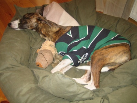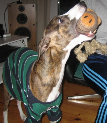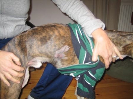 …kann bei unseren dünnhäutigen Whippchen so enden, wie hier bei Floppy. In der letzten Woche war er gemeinsam mit seinen „Kumpels“, mit denen er nun schon so häufig gespielt hat, unterwegs. Diese Gemeinschaft besteht aus sechs Hunden verschiedener Rassen und Größen, die sich „bombig“ verstehen. Leider wurde Floppy beim Toben von der Pfote bzw. den Krallen eines anderen Hundes so ungünstig getroffen, dass er eine Wunde davontrug, die genäht werden musste. Dazu war eine Narkose notwendig, die er aber gut weggesteckt hat. Tanja war sehr besorgt um ihren Schatz aber nun ist alles überstanden. Somit hat er seine erste Operation in Narkose hinter sich, der hoffentlich keine weitere folgen wird. Die Fäden konnten nach einer Woche schon gezogen werden. Floppy war total brav und hat noch nicht einmal versucht, an seine Wunde zu kommen oder sich des eigens zum Schutz angeschafften Pyjamaoberteils (aus der Kleinkinderabteilung) zu entledigen.