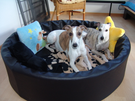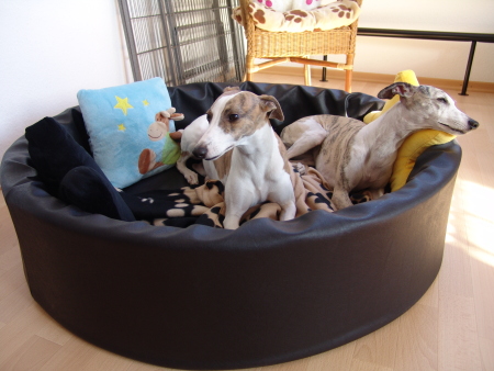 Das neue große Kunstlederkörbchen steht schon da, in das Kopete dann nach Verlassen der Wurfkiste mit ihren Babys umziehen wird. Drum herum werden dann die Welpengitterchen aufgebaut.