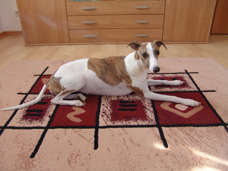 Unser Gästezimmer wurde nun als zukünftiges Welpenzimmer umfunktioniert. Es ist ein schönes helles von der Vormittagssonne durchflutetes Zimmer in der oberen Etage. Den Laminatboden haben wir mit PVC abgedeckt, so dass den Welpen später der gesamte Bereich als Spielplatz zur Verfügung steht. Das Gästebett bleibt noch stehen, so kann ich mich mit Kopete zurückziehen und auf die beginnende Geburt warten und danach auch noch bei ihr und ihren Welpen bleiben.